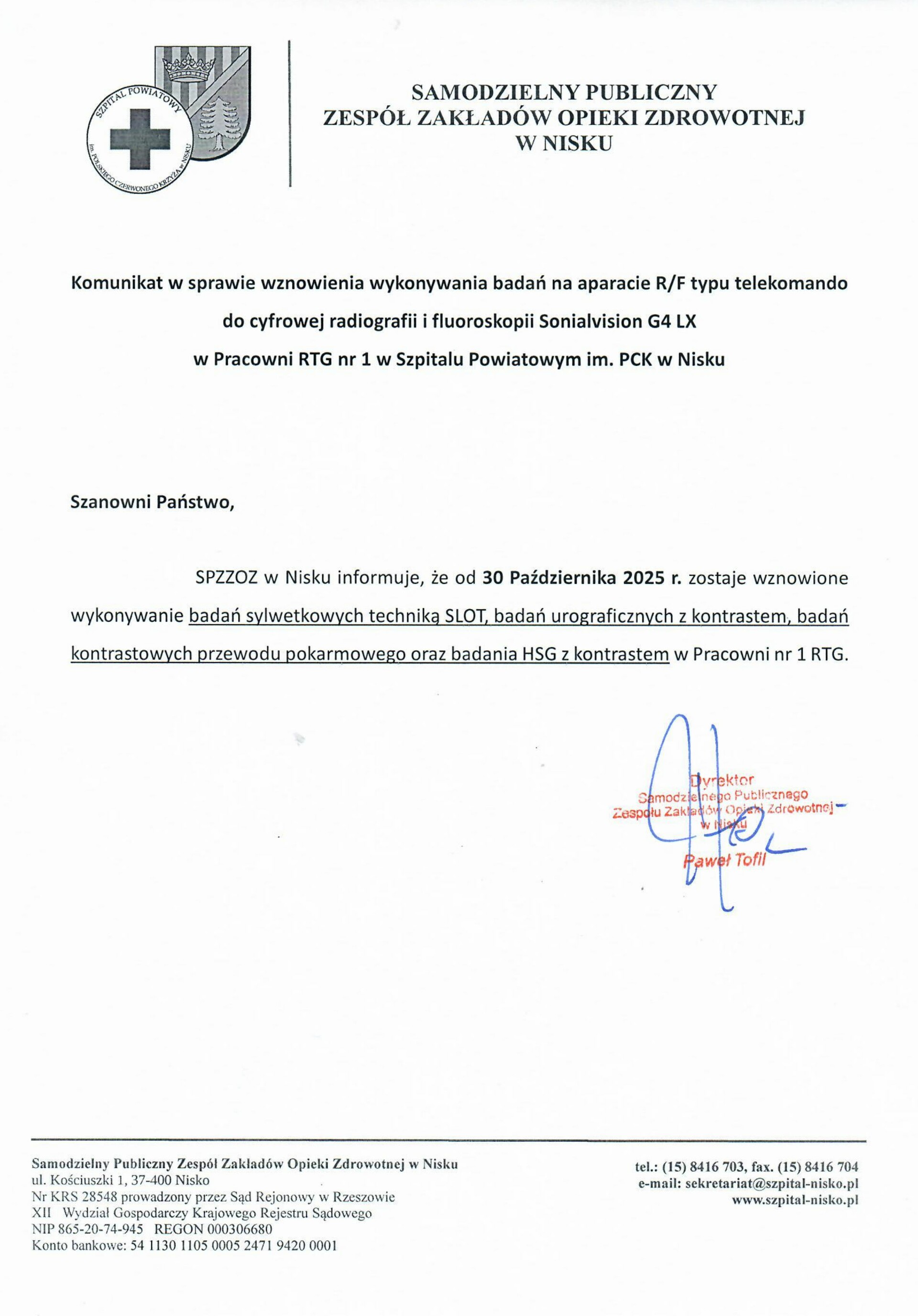 Komunikat w sprawie wznowienia wykonywania badań sylwetkowych techniką SLOT.