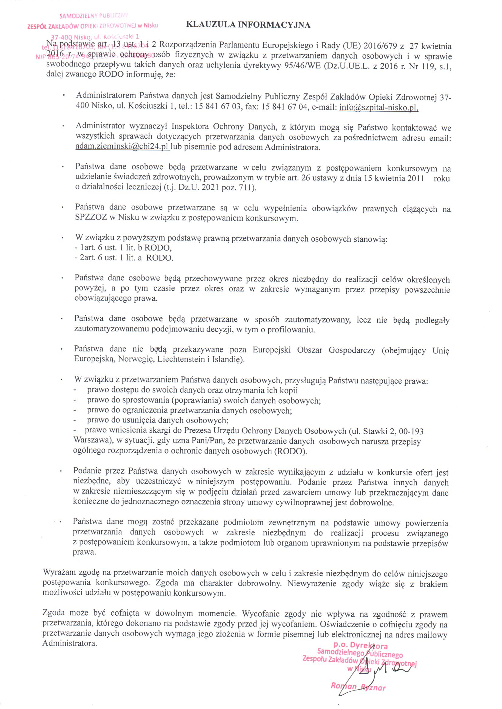 I. Konkurs ofert na świadczenie usług zdrowotnych przez technika elektroradiologii w Pracowni Diagnostyki Obrazowej i Tomografii Komputerowej.